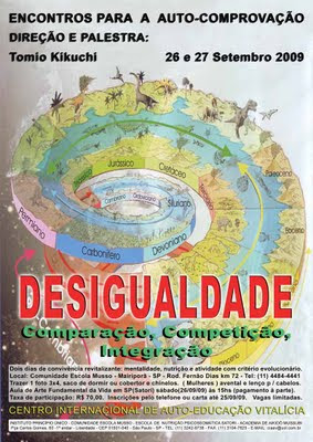 Dois dias de convivência revitalizante: mentalidade, nutrição e atividade com critério evolucionário. Local: Comunidade Escola Musso - Mairiporã - SP - Rod. Fernão Dias km 72 - Tel: (11) 4484-4441. Trazer 1 foto 3x4, saco de dormir ou cobertor e chinelos. Mulheres: avental e lenço p / cabelos. Taxa de participação: R$ 70,00. Inscrições pelo telefone ou carta até 23/10/09. Vagas limitadas.