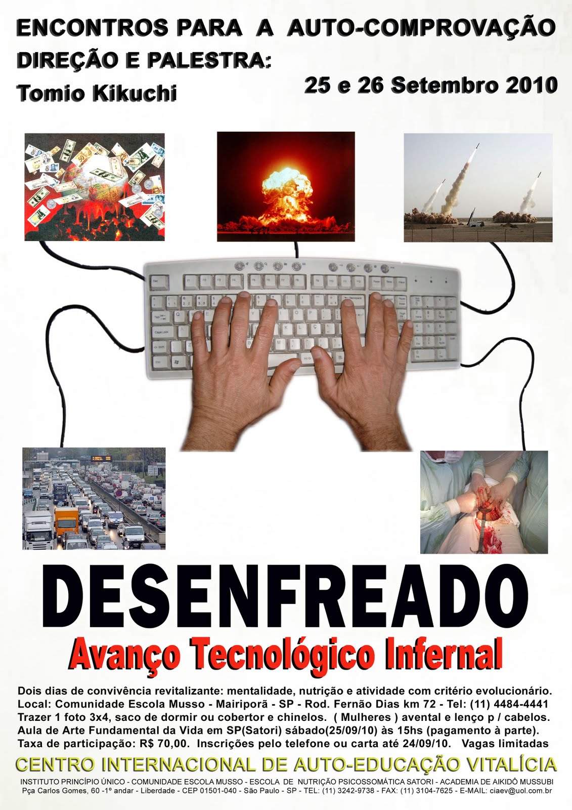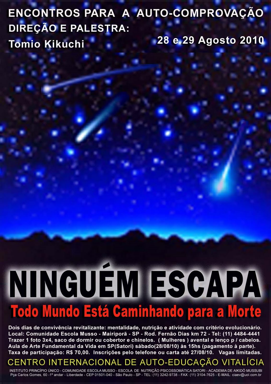 Dois dias de convivência revitalizante: mentalidade, nutrição e atividade com critério evolucionário. Local: Comunidade Escola Musso - Mairiporã - SP - Rod. Fernão Dias km 72 - Tel: (11) 4484-4441. Trazer 1 foto 3x4, saco de dormir ou cobertor e chinelos. Mulheres: avental e lenço p / cabelos. Taxa de participação: R$ 70,00. Inscrições pelo telefone ou carta até 27/08/10. Vagas limitadas.