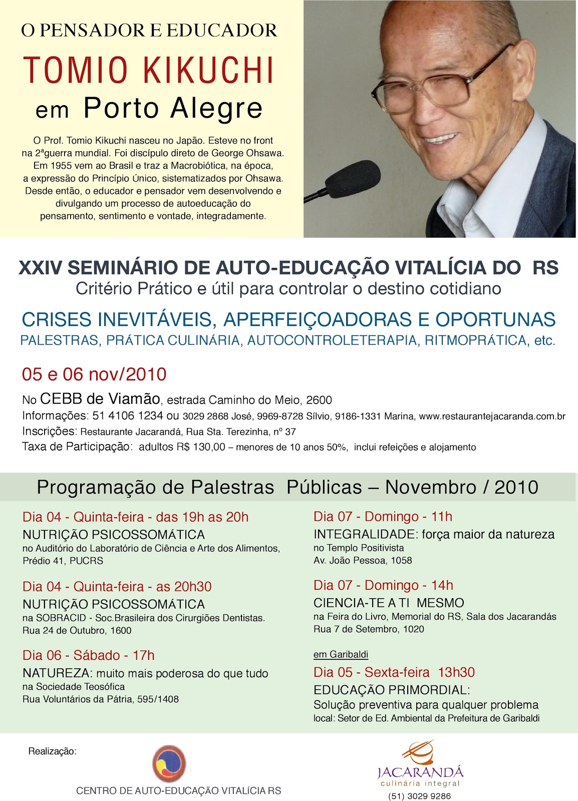 O Centro de Autoeducação Vitalícia do Rio Grande do Sul estará realizando de 5 a 6 de Novembro 2010 o XXIV Seminário de Autoeducação Vitalícia do RS, com a presença do Professor Tomio Kikuchi. Maiores informações pelos tels:
