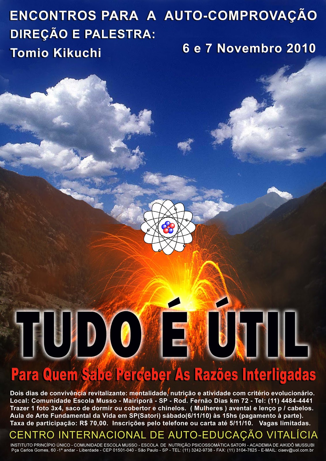 Dois dias de convivência revitalizante: mentalidade, nutrição e atividade com critério evolucionário. Local: Comunidade Escola Musso - Mairiporã - SP - Rod. Fernão Dias km 72 - Tel: (11) 4484-4441. Trazer 1 foto 3x4, saco de dormir ou cobertor e chinelos. Mulheres: avental e lenço p / cabelos. Taxa de participação: R$ 70,00. Inscrições pelo telefone ou carta até 05/11/10. Vagas limitadas.