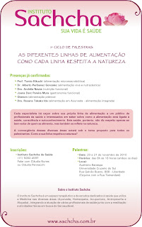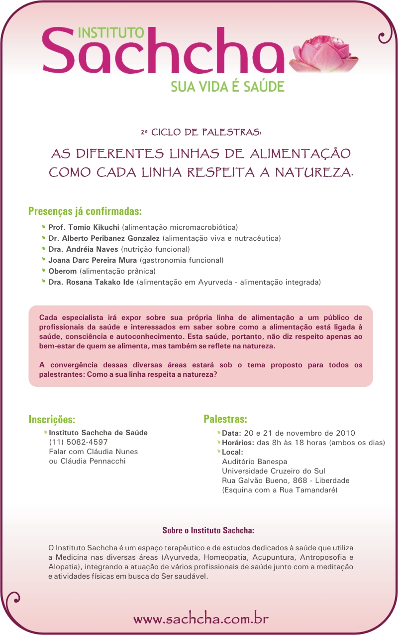 o Instituto Sachcha de Saúde promove, pelo 2o. ano, o Ciclo de Palestras com o tema "As Diferentes Linhas de Alimentação", destinado a pessoas (leigas ou profissionais da área) que buscam compreender a importância central da alimentação em sua saúde física e mental.
