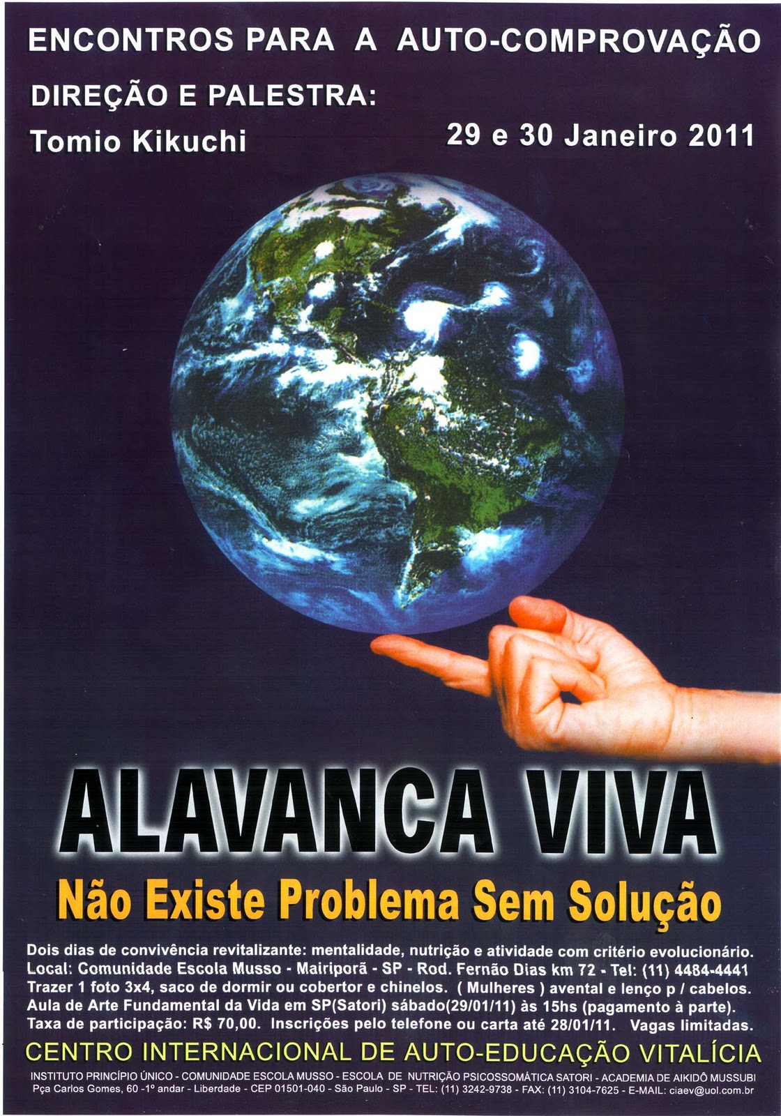 Dois dias de convivência revitalizante: mentalidade, nutrição e atividade com critério evolucionário. Local: Comunidade Escola Musso - Mairiporã - SP - Rod. Fernão Dias km 72 - Tel: (11) 4484-4441. Trazer 1 foto 3x4, saco de dormir ou cobertor e chinelos. Mulheres: avental e lenço p / cabelos. Taxa de participação: R$ 70,00. Inscrições pelo telefone ou carta até 29/01/11. Vagas limitadas.
