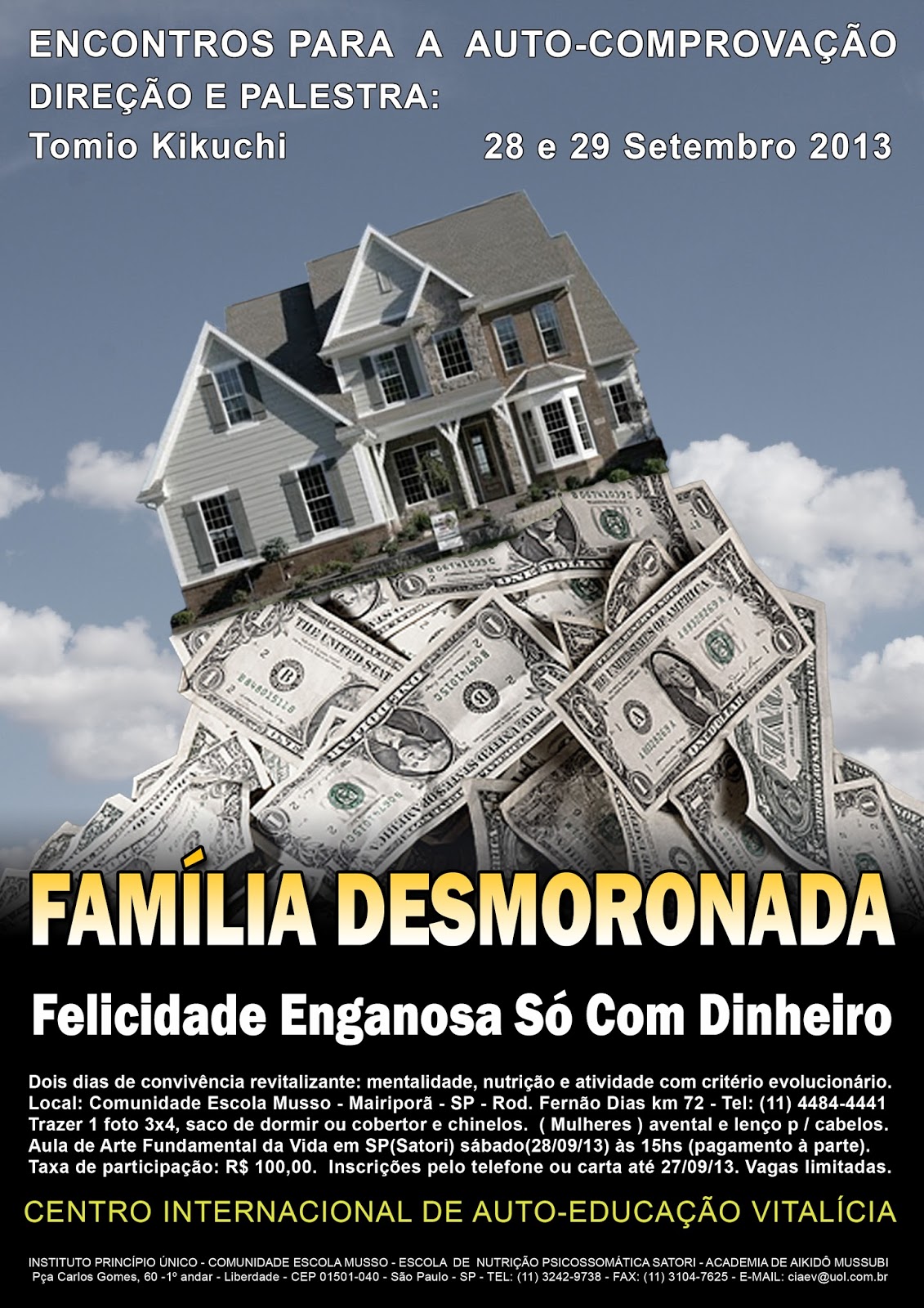 Dois dias de convivência revitalizante: mentalidade, nutrição e atividade com critério evolucionário. Local: Comunidade Escola Musso - Mairiporã - SP - Rod. Fernão Dias km 72 - Tel: (11) 4484-4441. Trazer 1 foto 3x4, saco de dormir ou cobertor e chinelos. Mulheres: avental e lenço p / cabelos. Taxa de participação: R$ 100,00. Inscrições pelo telefone ou carta até 23/08/13. Vagas limitadas.