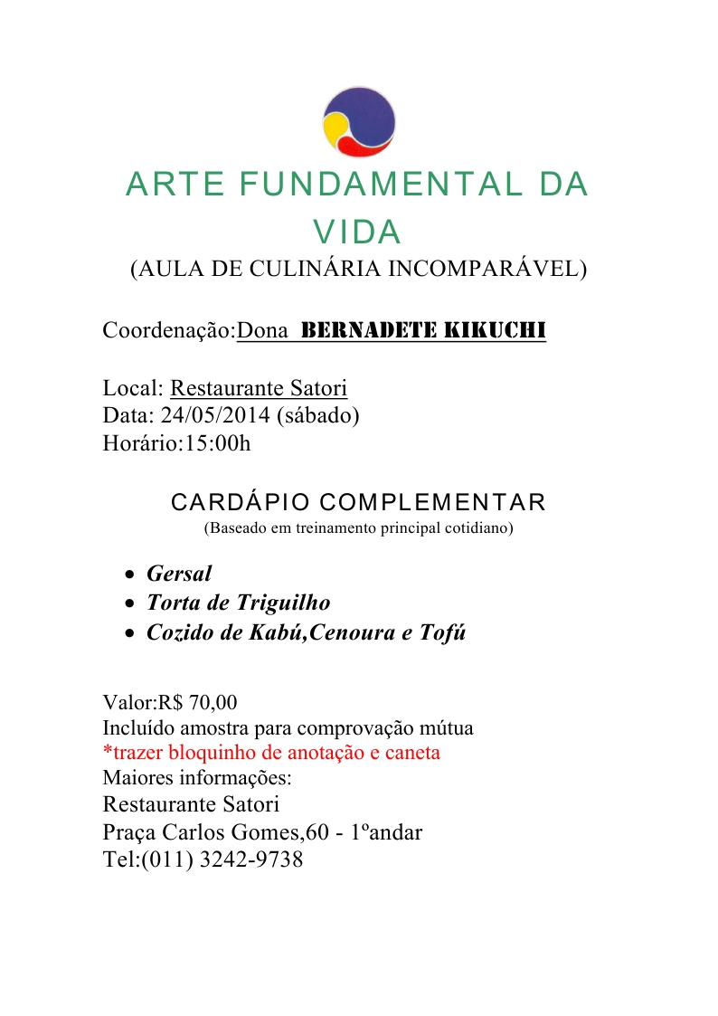 Aula de Arte Fundamental da Vida em SP(Satori) sábado (24/05/14) às 15hs (pagamento à parte).