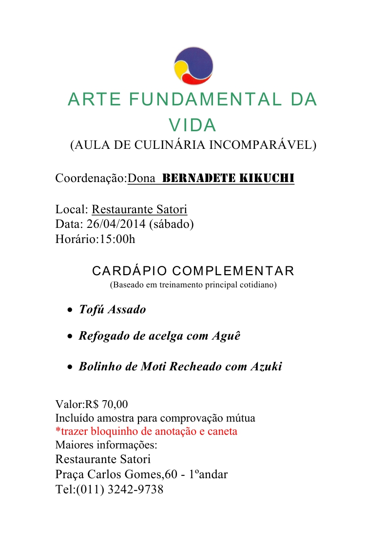 Aula de Arte Fundamental da Vida em SP(Satori) sábado (26/04/14) às 15hs (pagamento à parte).